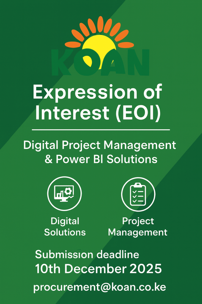 The Kenya Organic Agriculture Network (KOAN) is pleased to invite qualified and experienced service providers to submit Expressions of Interest (EOI) for the supply, installation, and training of digital systems to strengthen our project management, monitoring, evaluation, learning, and reporting functions.