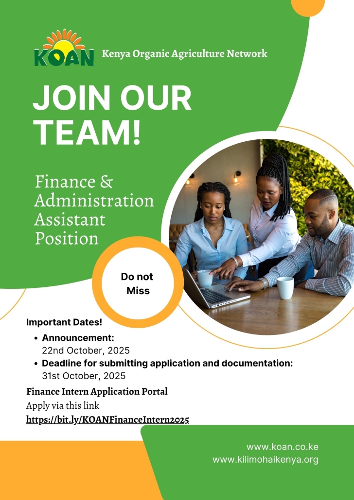 Kenya Organic Agriculture Network (KOAN) is a national membership organization that promotes the development of organic agriculture in Kenya. It brings together key stakeholders including farmers, NGOs and CBOs, research institutions, input suppliers, government agencies, exporters, retailers, and consumers. KOAN’s mission is to lead, coordinate, and promote the growth of the organic agriculture sector, highlighting its economic, environmental, and social benefits. We are seeking a proactive, detail-oriented, and dedicated Finance and Administration Assistant to support KOAN’s operational excellence and strategic growth.